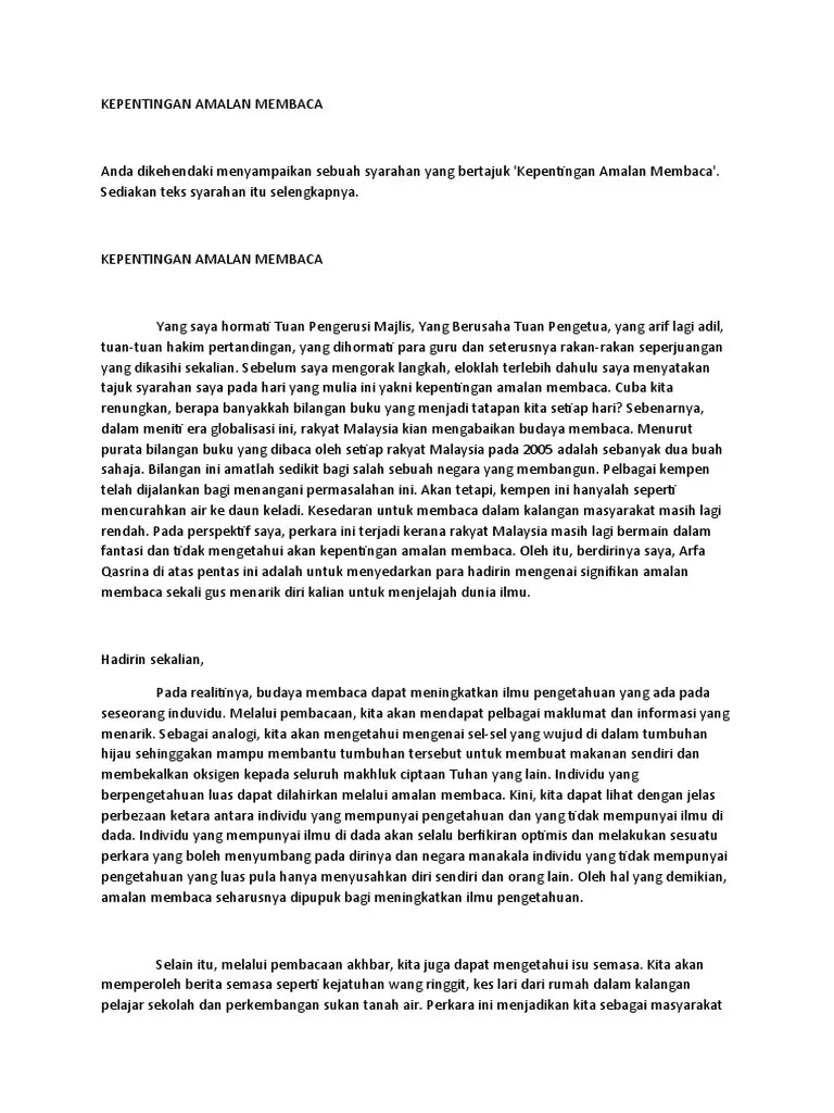 Kepentingan Amalan Membaca : Syarahan Faedah Membaca Buku Otosection. Kepentingan amalan membaca kepada masyarakat. Calon perlu menghuraikan kepentingan amalan membaca. Sebagai seorang pelajar, kita perlu memupuk minat membaca untuk menambahkan ilmu pengetahuan. Sediakan teks syarahan itu selengkapnya. Contoh karangan budaya membaca penting dalam kehidupan seharian. Contoh karangan kepentingan dan manfaat amalan membaca dalam melahirkan masyarakat cemerlang. Minat membaca merupakan amalan yang berfaedah kepada masyarakat terutamanya remaja. Perkongsian soalan, nota, latihan, skema jawapan, bahan rujukan dan informasi terkini blog usaha padu dapat membantu para guru, .